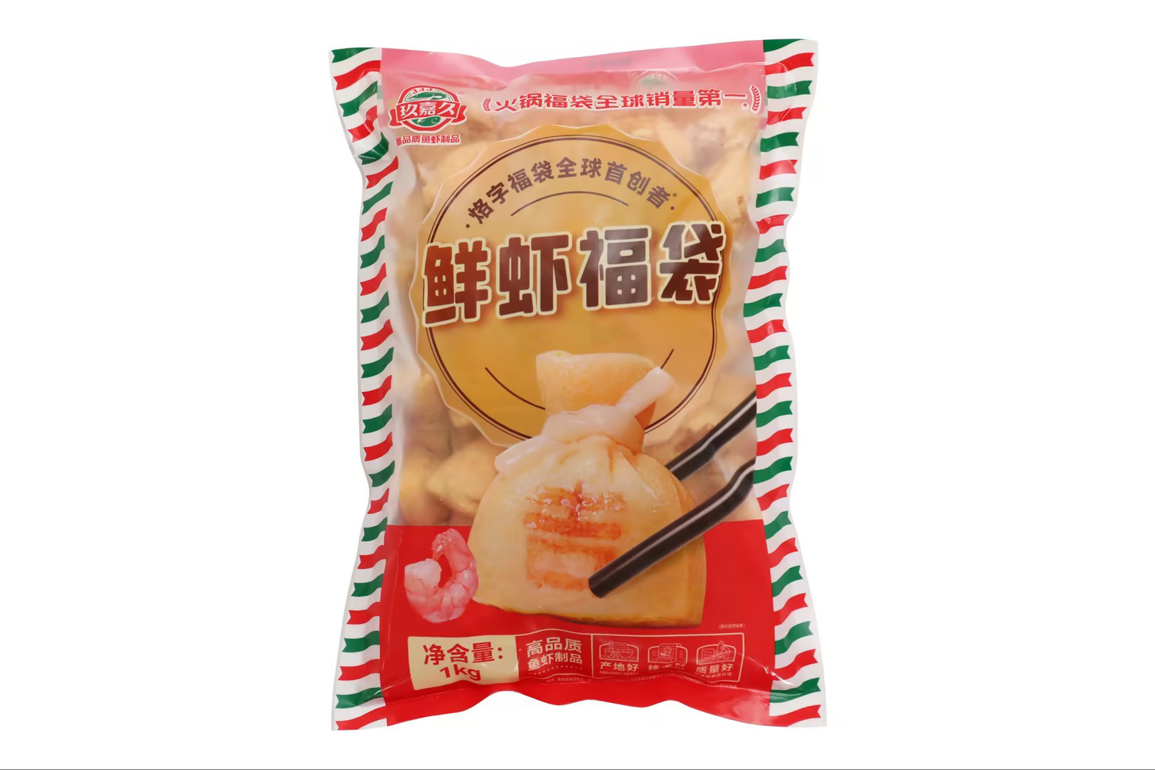 产品特性:采用优质豆皮包裹虾仁、鱼浆和鱼籽,外皮印了一个“吉”字,意头十足,形状如袋子故称福袋!
